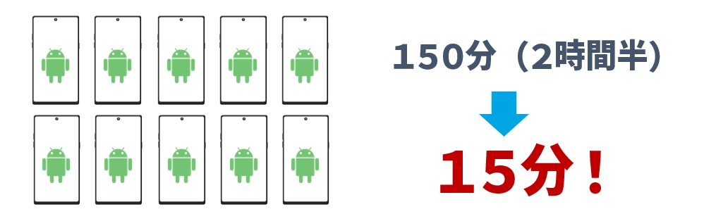 例えば、1台につき15分の設定作業を10台で実施した場合は、150分(2時間半)の所要時間が想定されますが、「ゼロタッチ端末一括登録サービス」を利用すれば、1台分の15分程度で10台分の設定が同時完了となりますので、工数の大幅削減や人的な設定ミスを防止して企業様の業務効率化に大きく貢献致します。