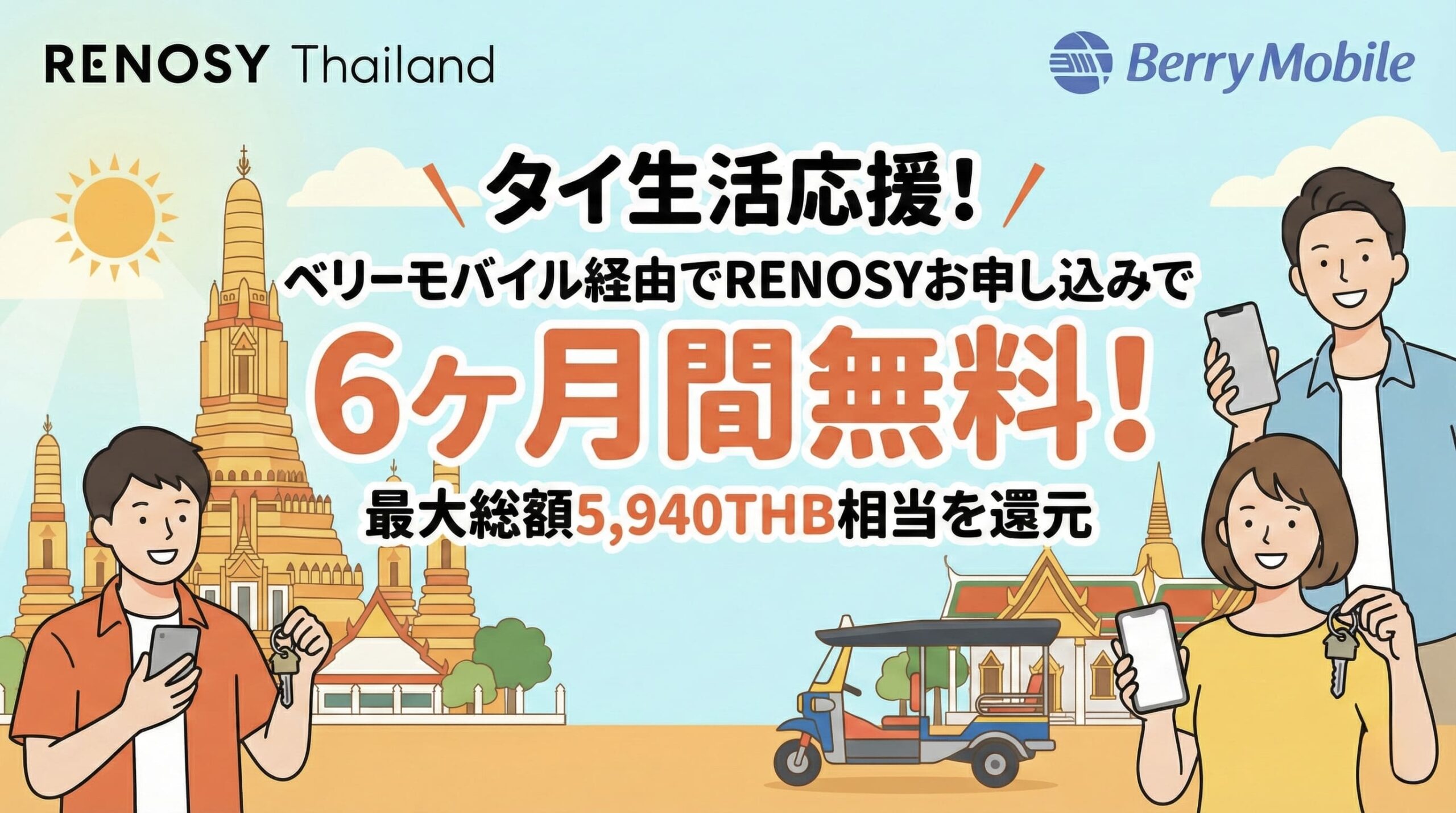 これからタイへのご赴任や、新生活の準備をされる皆様に、ビッグニュースです! この度、バンコクの日本人向け不動産仲介で絶大な支持を誇る「dearlife by RENOSY(ディアライフ・バイ・リノシー)」様と、ベリーモバイルの特別コラボキャンペーンが決定いたしました。